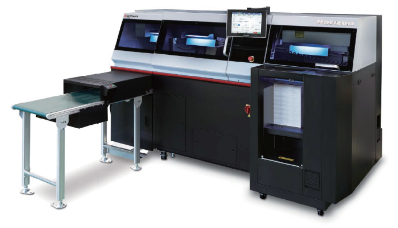 Horizon SPF-200A数码骑订联动线,支持“一键换版”的智能骑订设备,搭载10.4英寸彩色触摸屏,可存储200项作业参数,生产速度高达4500册/小时,支持A5至A3多种尺寸装订,适配120×180mm至356×508mm多种尺寸纸张,覆盖商务印刷与个性化定制需求。