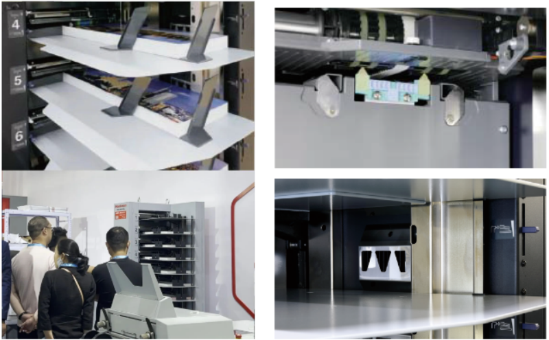 采用10料仓旋转吸气式给纸系统,支持扩展至60格料仓,配页速度高达9000套/小时,适配52-208gsm多种纸张,配备双张检测传感器与无线遥控操作,实现“零停机”高效生产!